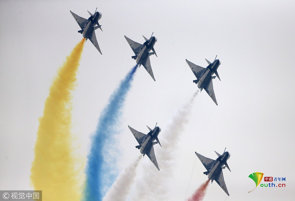 2018年11月8日,广东珠海,第十二届中国国际航展第三天。空军“八一”飞行表演队的队员们,发扬连续作战精神,给观众们表演了七机分组开花、四机编队横滚等高难动作,受到观众们的称赞。视觉中国