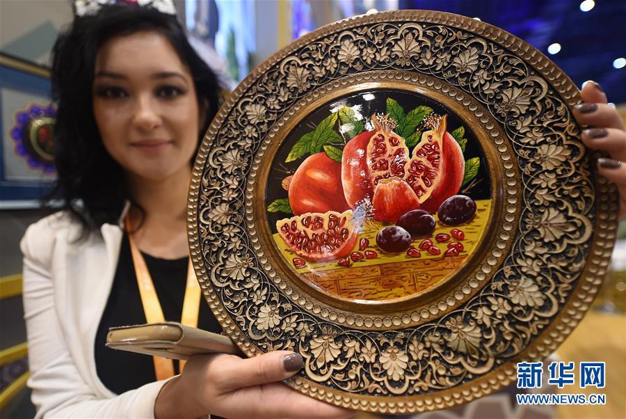11月8日,乌兹别克斯坦参展人员展示手工制作的核桃木工艺品。 新华社记者 韩瑜庆 摄