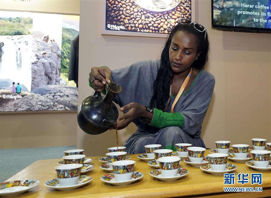 11月6日,在首届中国国际进口博览会上,埃塞俄比亚参展人员为参观者倒咖啡。新华社记者 沈伯韩 摄