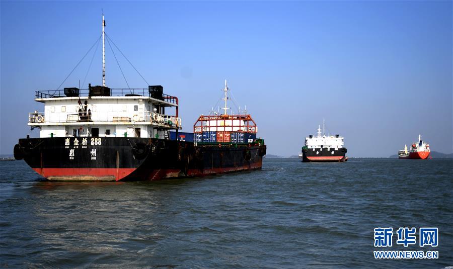 这是在钦州茅尾海上,万吨海轮陆续进入钦州港营运货物(2017年12月18日摄)。新华社记者 张爱林 摄