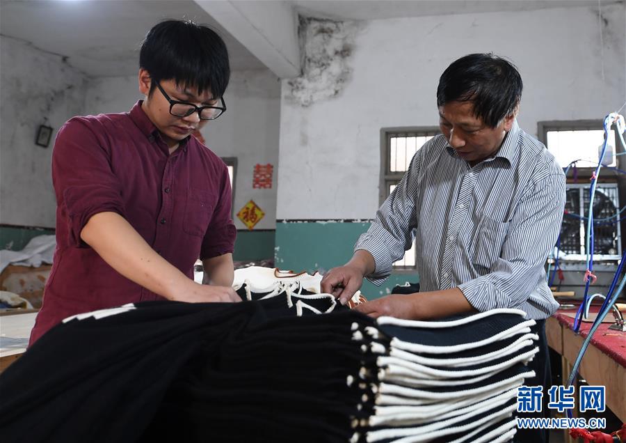 在苏州市吴江区七都镇开弦弓村,“90后”村民姚凌超(左)和父亲姚玉坤在自家针织衫加工作坊里整理产品(10月23日摄)。近年来,开弦弓村形成了化纤纺织、针织衫编织和水产养殖三大产业,2017年村集体收入268万元,农民人均可支配收入3万多元。 新华社记者 季春鹏 摄