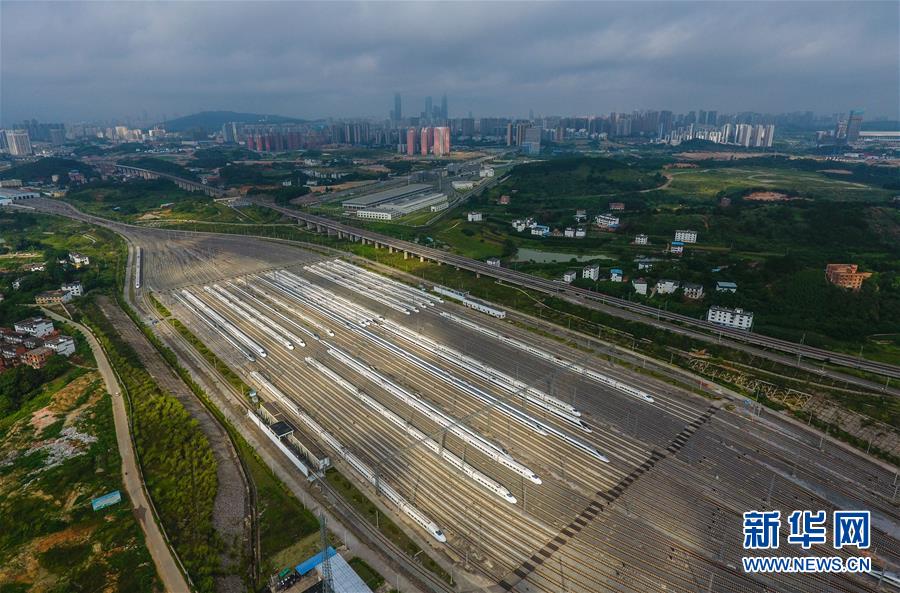 这是广西南宁动车所内准备发往各地的动车组列车(7月1日无人机拍摄)。 近年来,广西在海、陆、空立体式推进与东盟国家的互联互通,扎实推进“高速县县通、高铁市市通、民航片片通、内河条条通”建设。目前高铁运营里程1751公里,高速公路总里程突破5000公里,沿海和内河港口年吞吐能力分别达2.5亿吨和1.1亿吨,机场旅客年吞吐能力近3000万人次,内外交通便捷度全面提升。 新华社记者 黄孝邦 摄