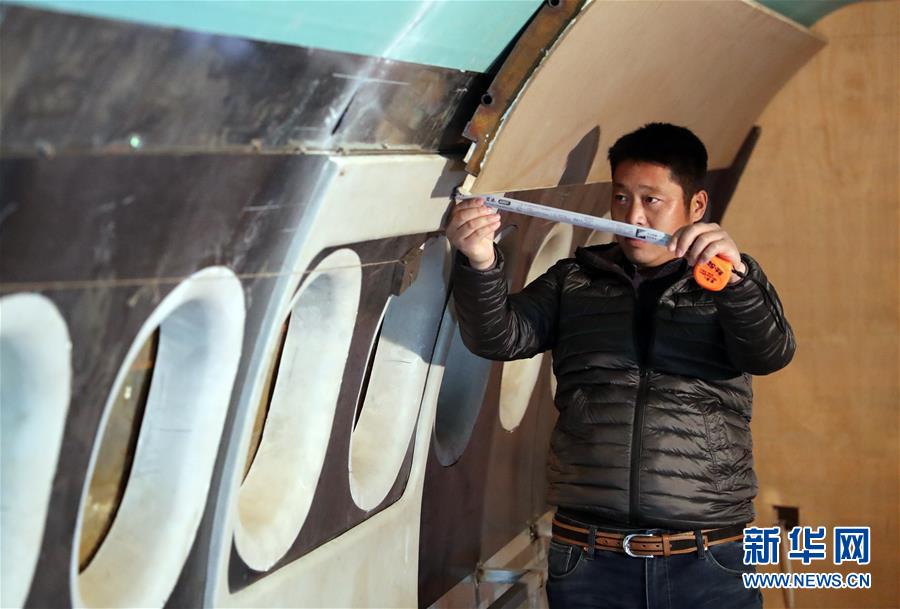 11月10日,在辽宁开原老城街道前三台子村,朱跃在“飞机”内部测量安装尺寸。 新华社记者 杨青 摄
