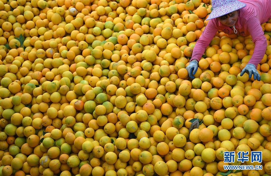 江西省寻乌县晨光镇桂花村的果农在挑拣刚采摘的脐橙(11月10日摄)。新华社记者 万象 摄