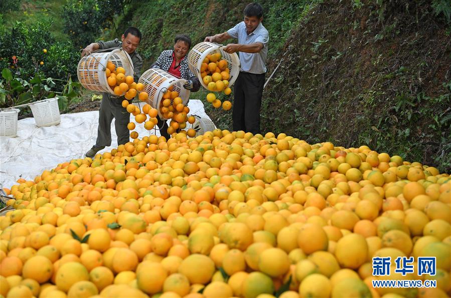 江西省寻乌县晨光镇桂花村的果农集中堆放刚采摘的脐橙(11月10日摄)。新华社记者 万象 摄