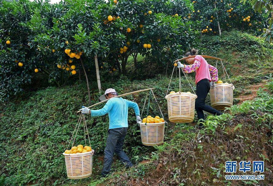 江西省寻乌县晨光镇桂花村的果农在挑运脐橙(11月10日摄)。新华社记者 万象 摄