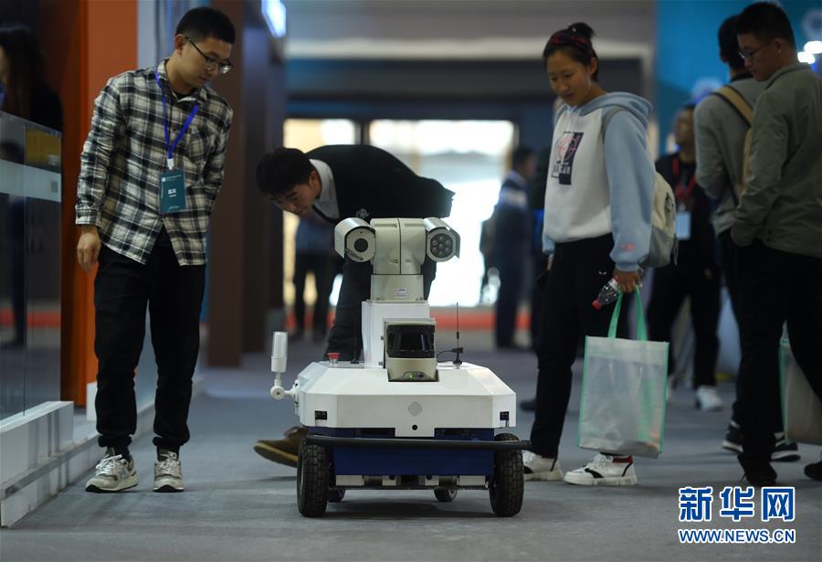 11月10日,人们在展会现场观看展出的一款电力巡检机器人。
