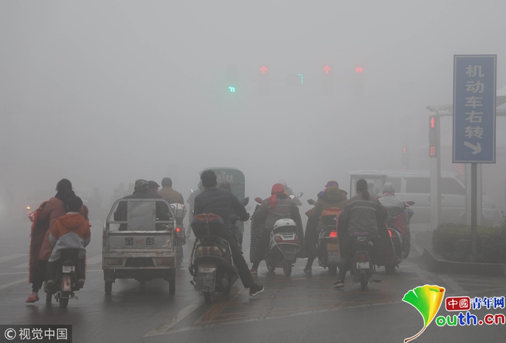 2018年11月12日,河南平顶山宝丰县出现大雾, 街头汽车打开雾灯,行人小心行走。