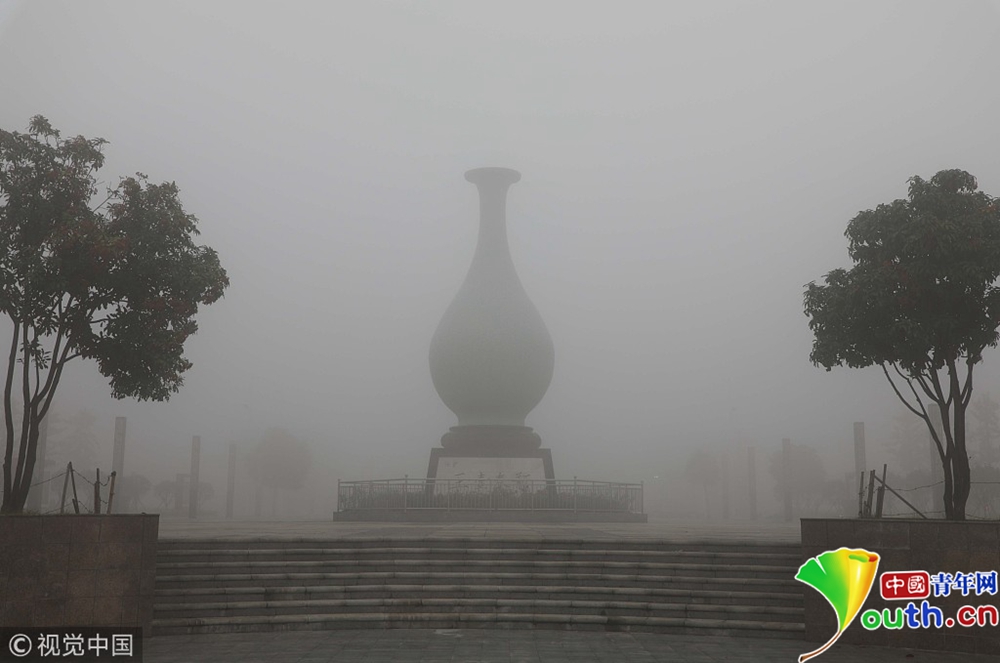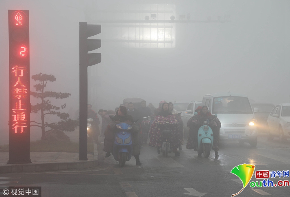 2018年11月12日,河南平顶山宝丰县出现大雾, 街头汽车打开雾灯,行人小心行走。