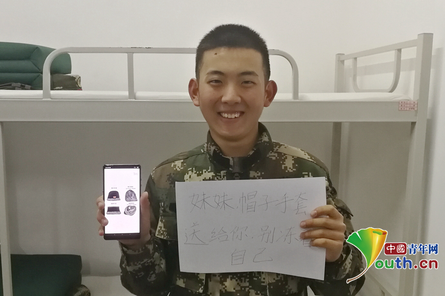 “俺们东北那旮瘩冬天特别冷,给妹妹买个防寒帽和棉手套,这样上学就不会冷了。”武警北京总队执勤第二支队供图。