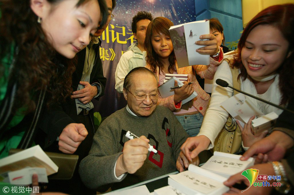 2005年12月17上午,中国南北文坛两位大侠金庸和二月河在深圳五洲宾馆和各地记者进行了一场精彩对话。金庸迷找金庸签名。图片作者:北辰