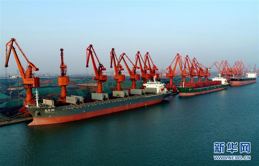 轮船靠泊在唐山港京唐港区散货码头卸载(11月12日无人机拍摄)。记者从河北省交通运输厅港航管理局获悉,今年1至10月,河北港口完成货物吞吐量达9.5亿吨,同比增长4.3%。 新华社记者 杨世尧 摄