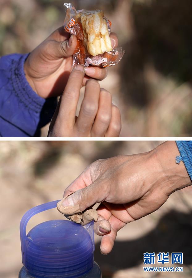 拼版照片:上图为陈喜波的妻子王登兴在棉田里用简单的食品作午餐;下图为陈喜波在午餐时准备喝水(10月23日摄)。