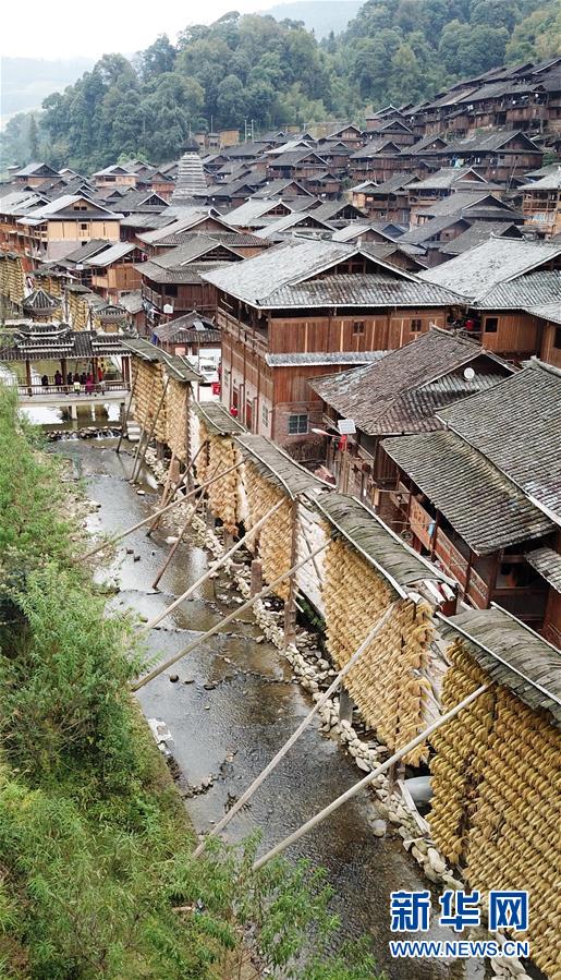 贵州省黔东南苗族侗族自治州从江县高增乡占里村晾满稻谷的禾晾架与侗寨房屋相映成景(10月17日无人机拍摄)。 金秋时节,农民们忙着收获成熟的农作物,喜迎丰收。 新华社记者陈晔华摄