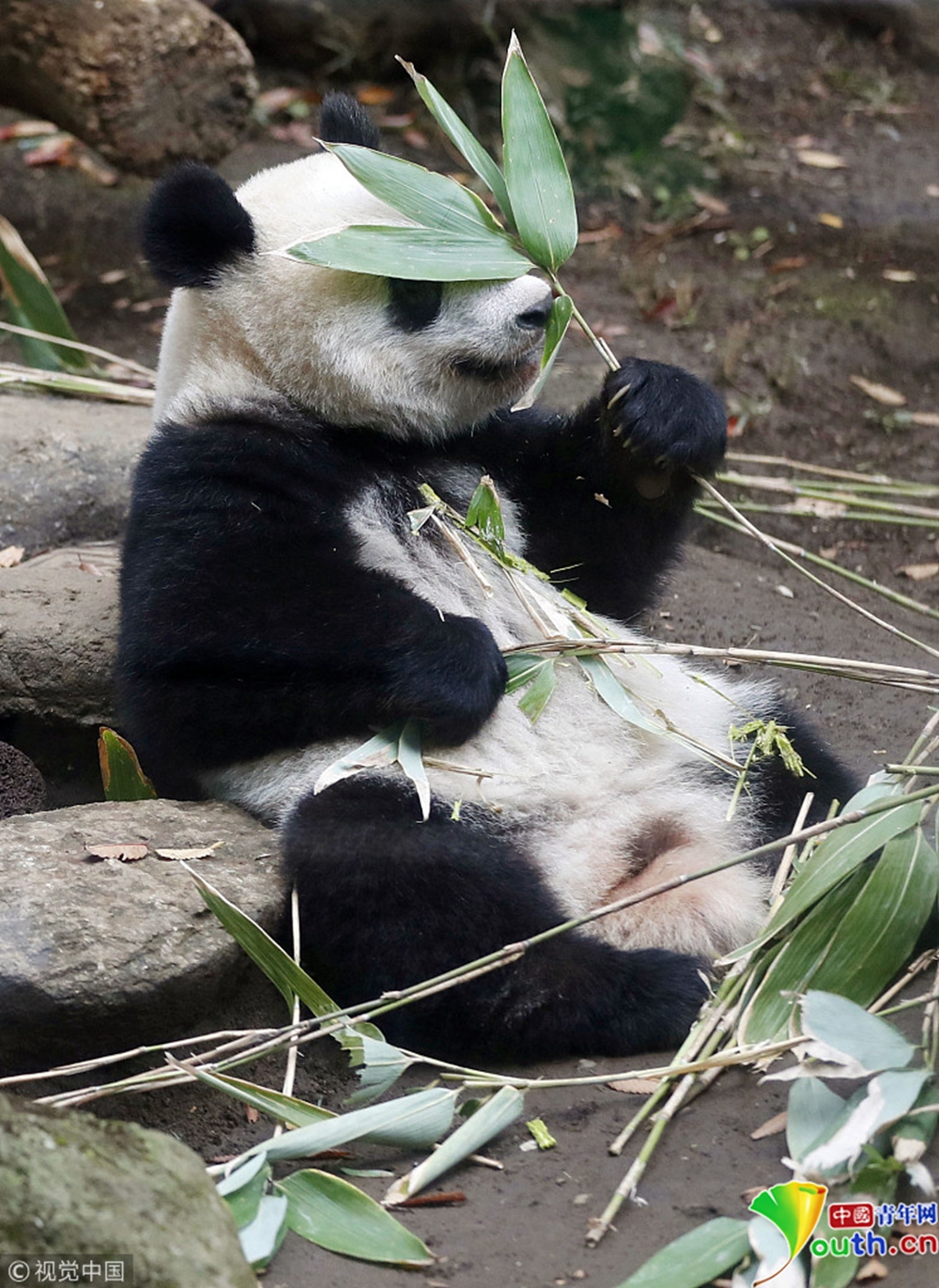 9月7日,大熊猫七仔在陕西省珍稀野生动物抢救饲养研究中心内吃竹笋。