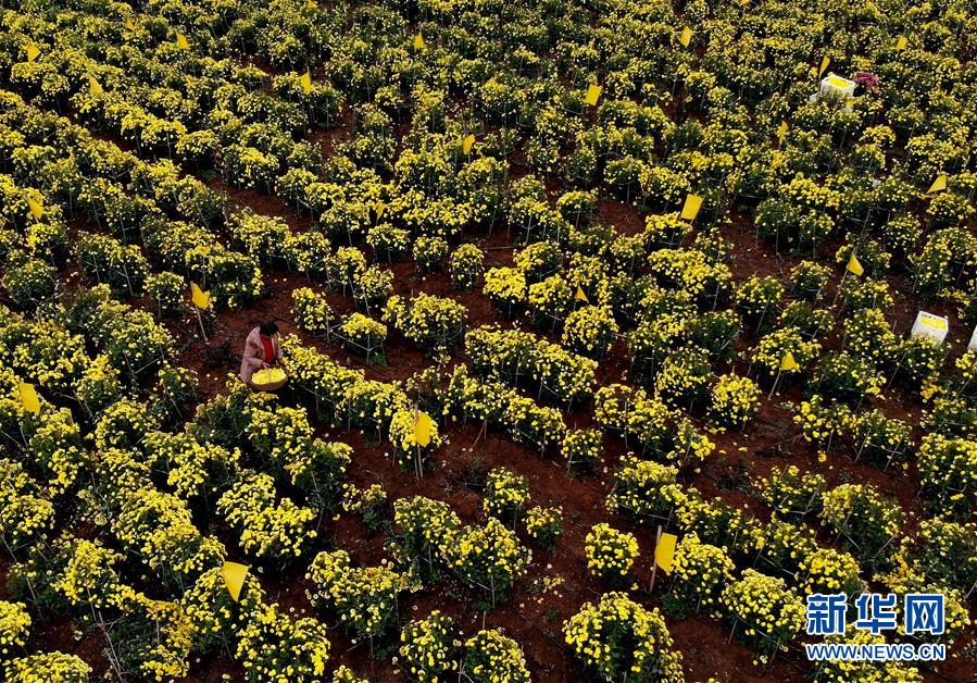 11月14日,在河南省内乡县乍曲镇水沟村千亩郦邑贡菊基地,农户在采摘菊花(无人机拍摄)。 近年来,河南省内乡县依托资源优势,把发展特色农业作为精准扶贫的重要举措,采取“公司+合作社+农户”的方式,招引农业龙头企业发展菊花种植产业,把菊花加工成茶饮、药材等高附加值产品,累计带动150余户贫困户就业增收。 新华社记者 李安 摄