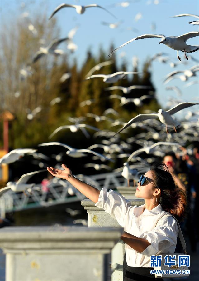 近日,云南省昆明市阳光明媚、气候宜人,不少市民和游客来到滇池大坝、大观公园等地,观赏前来越冬的红嘴鸥。