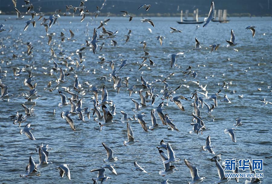 这是11月14日拍摄的在昆明滇池上飞翔的红嘴鸥。 新华社记者 蔺以光 摄