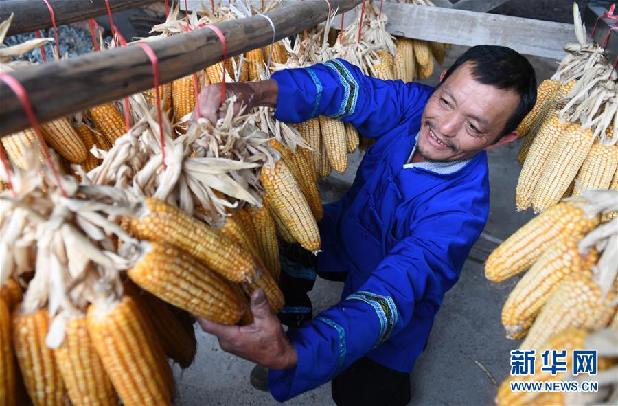 11月14日,在广西龙胜各族自治县泗水乡八滩村,侯光祖的父亲王成建在晾晒玉米。