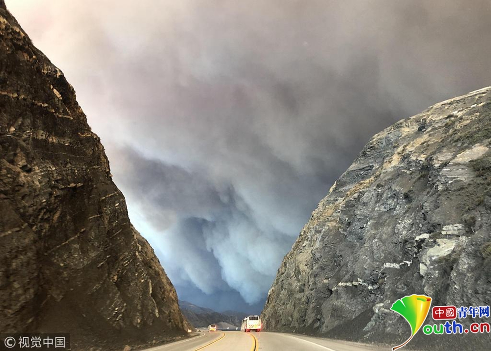 该郡第二大城市千橡树市(Thousand Oaks)等很多地方房屋被毁,高速公路封闭,居民紧急疏散。洛杉矶郡圣盖博市(San Gabriel)警察局警官日瓦戈(O. Zhivaga)和同事们当天清晨即受命驰援文图拉郡,保护当地居民和财产安全。图为消防车行驶在已封闭的公路上,天空中浓烟滚滚。