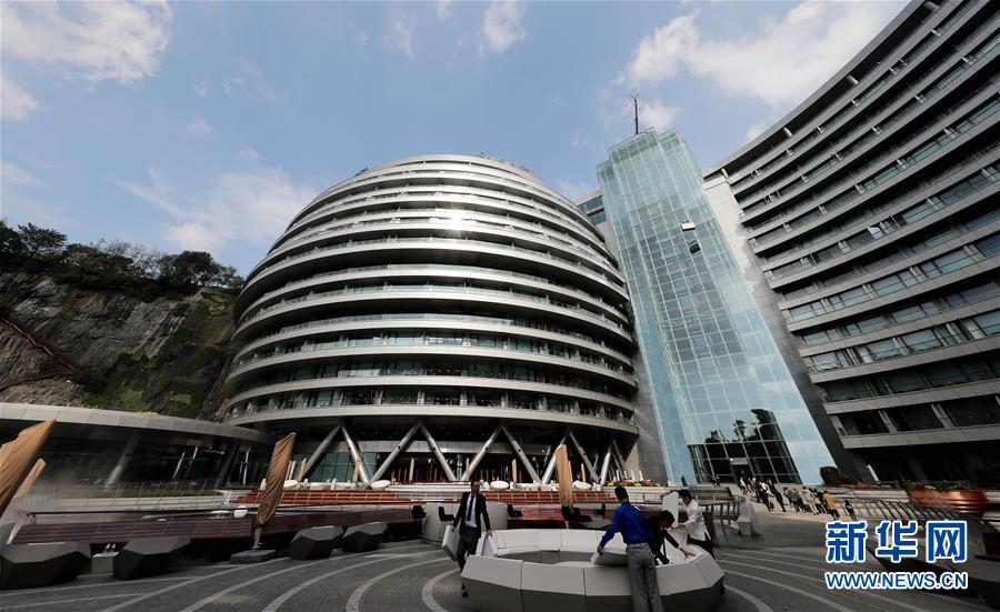 工作人员在矿坑底部的酒店亲水平台布置座椅(11月13日摄)。 位于上海松江的世茂洲际酒店11月15日正式开门营业。这家在一个废弃采石矿坑内建成的酒店成为上海又一新景。 新华社记者 方喆 摄