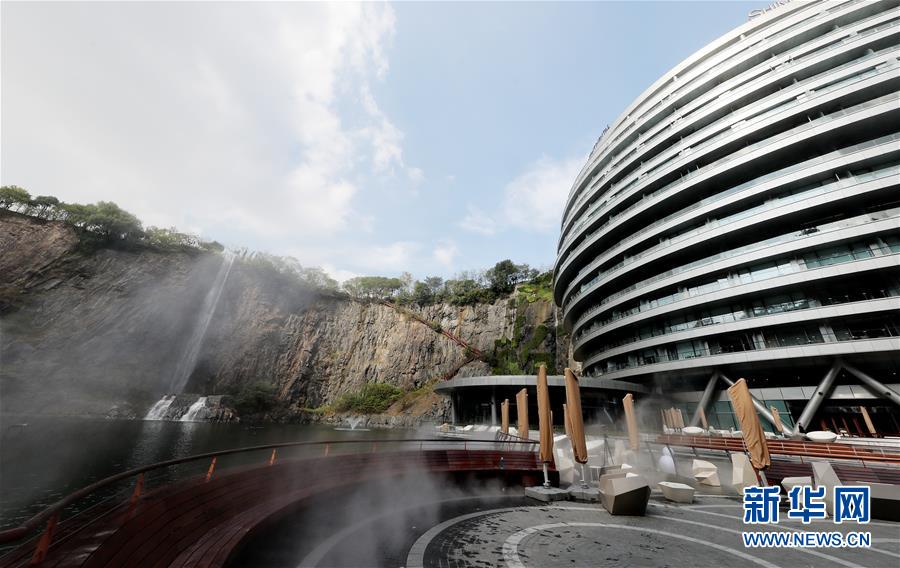 一条人造瀑布从酒店主体建筑旁的矿坑顶部流下(11月13日摄)。 位于上海松江的世茂洲际酒店11月15日正式开门营业。这家在一个废弃采石矿坑内建成的酒店成为上海又一新景。 新华社记者 方喆 摄