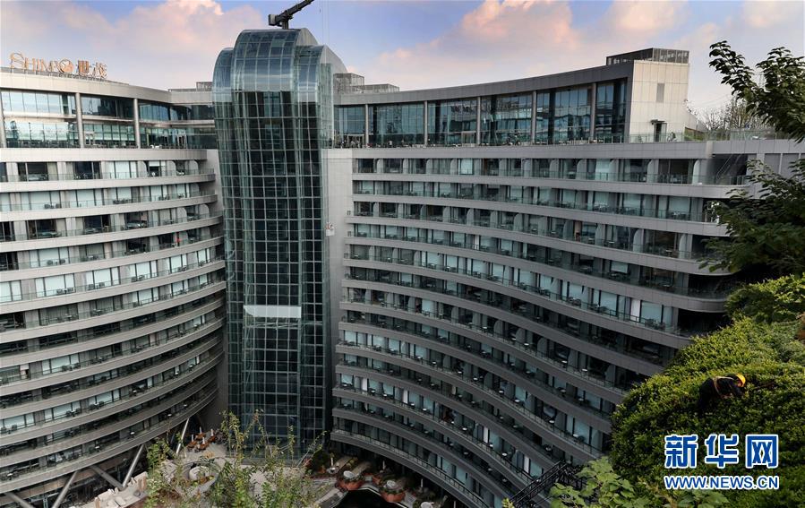 一名工人(右下)在位于酒店顶楼附近的崖壁上施工(11月13日摄)。 位于上海松江的世茂洲际酒店11月15日正式开门营业。这家在一个废弃采石矿坑内建成的酒店成为上海又一新景。 新华社记者 方喆 摄