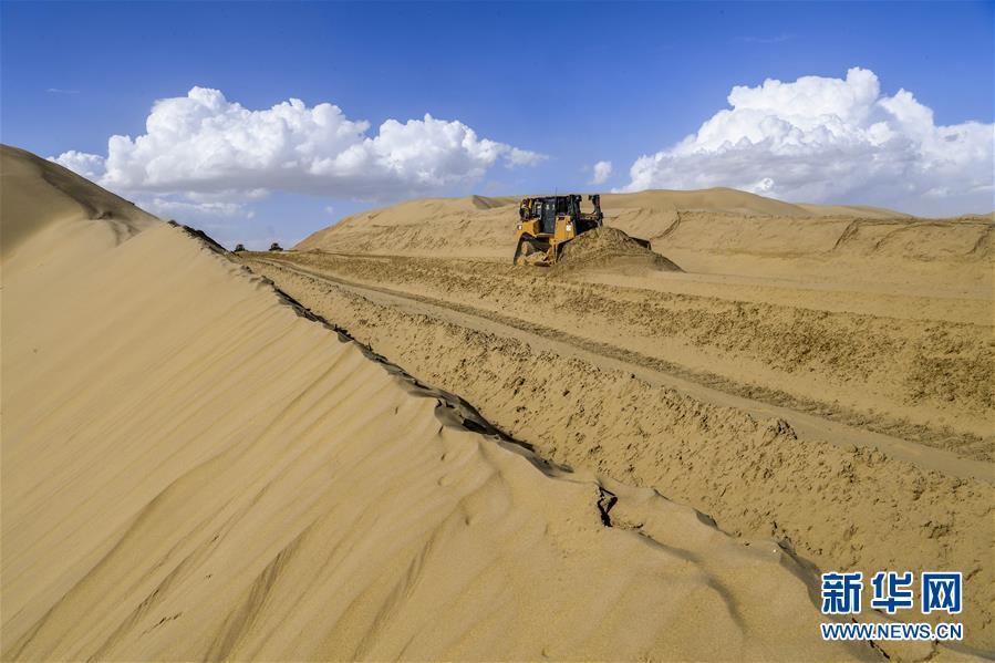 这是建设中的新疆且末县至尉犁县的沙漠公路(7月5日摄)。新华社记者 胡虎虎 摄