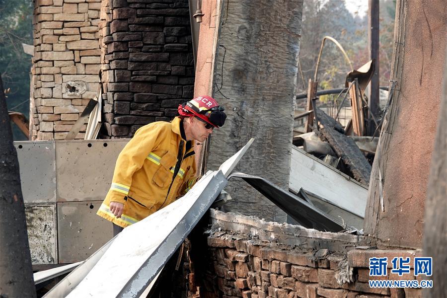 11月18日,在美国加利福尼亚州比尤特县天堂镇,一名消防人员查看废墟。 新华社记者吴晓凌摄