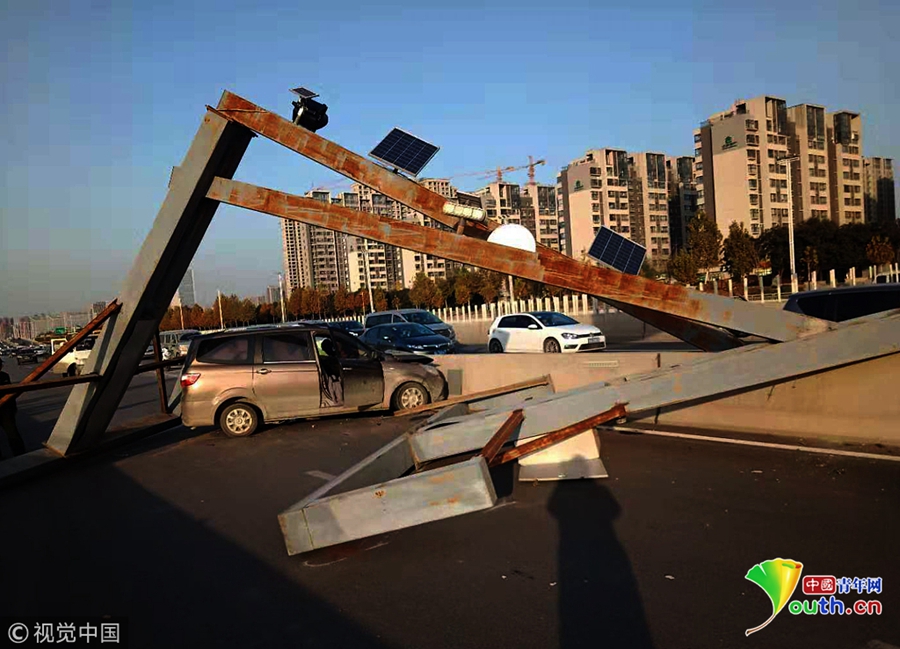 快速路司机开车“走神” 眨眼撞塌限高杆