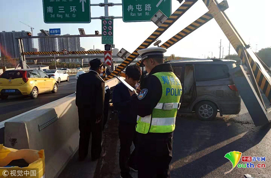 快速路司机开车“走神” 眨眼撞塌限高杆
