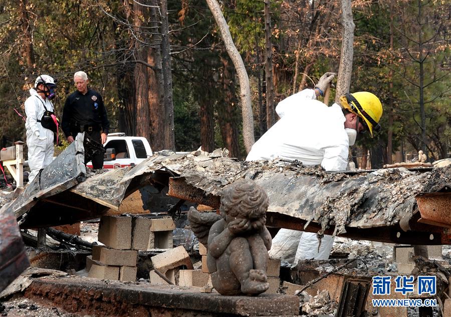 11月19日,在美国加利福尼亚州比尤特县天堂镇,救援人员在山火废墟中工作。新华社记者吴晓凌摄