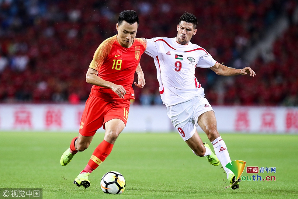 2018年11月20日,海口,2018国际足球友谊赛,中国男足Vs巴勒斯坦。郜林拼抢 图片作者:null