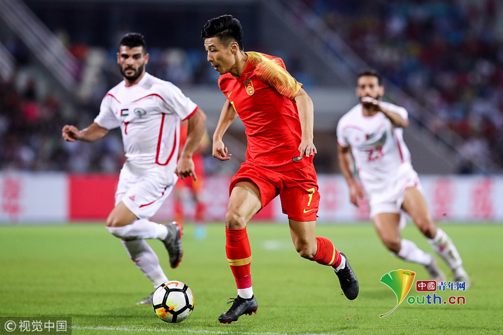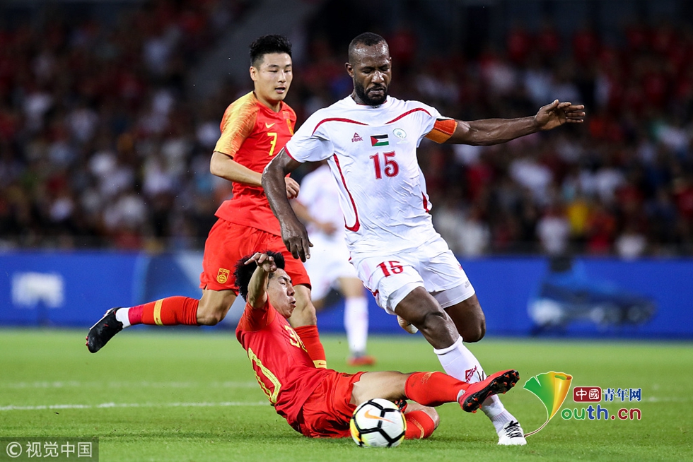 2018年11月20日,海口,2018国际足球友谊赛,中国男足Vs巴勒斯坦。郜林拼抢 图片作者:null