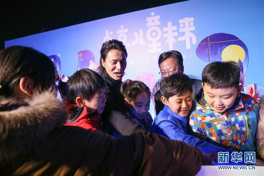 11月20日,在北京举行的世界儿童日主题活动上,联合国儿童基金会大使陈坤与孩子们共同点亮国家游泳中心。 新华社记者张玉薇摄