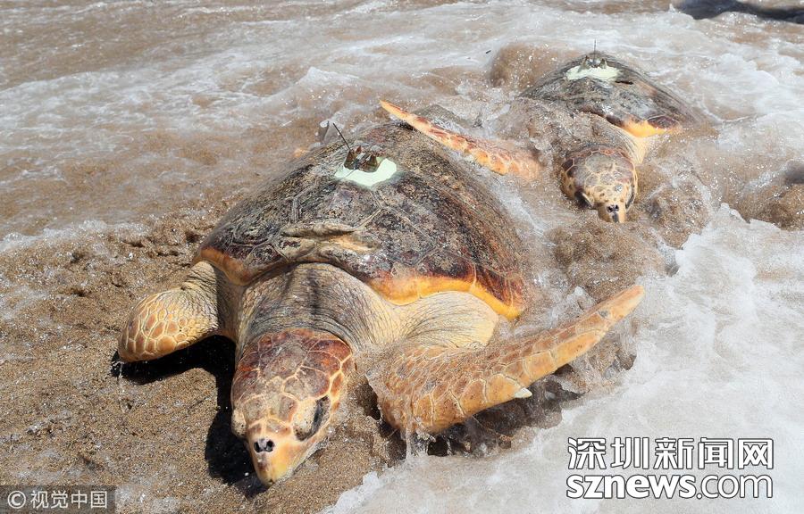 韩国水产部门举办海龟放生仪式 海龟背“天线”重归大海