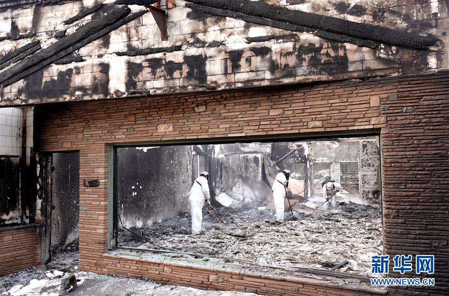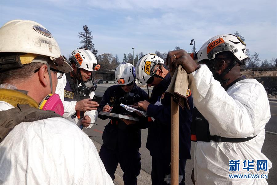 11月20日,在美国加利福尼亚州比尤特县天堂镇,救援人员在灾区工作。