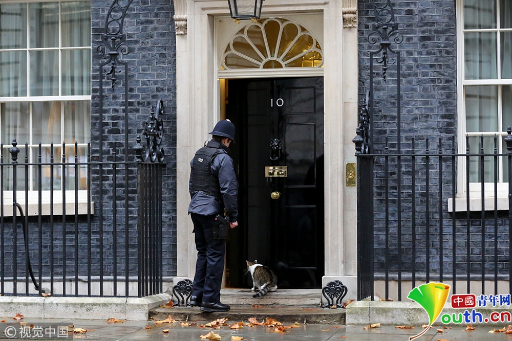 2018年11月22日讯,当地时间2018年11月20日,英国伦敦,在英国天空电视台当日就英“退欧”相关会议进行直播报道时,摄像机意外捕捉到了一副画面:被关在门外的拉里起先“安静且耐心地”蹲坐在唐宁街10号的黑色大门前,过了一会儿它淡淡地撇了一眼正在不远处执勤的警察。后者显然立马接收到了“首席猫”的眼神示意,他快速走上前来,替拉里敲开门,助它重返温暖的室内。据悉,唐宁街10号那扇赫赫有名的黑色大门只能由内部打开。