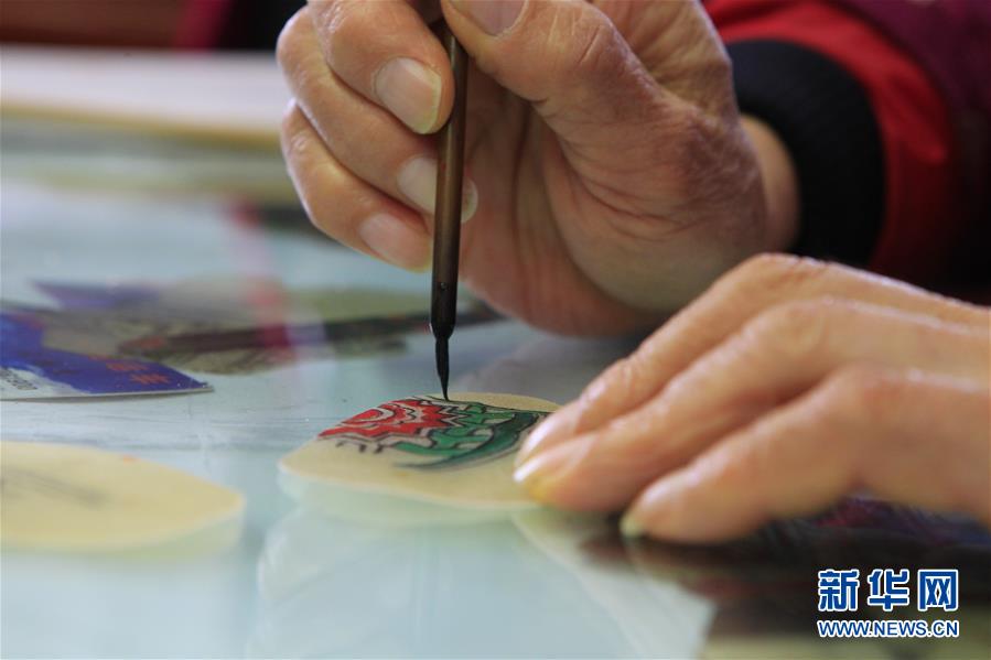 11月20日,在浙江海宁市南关厢历史街区,张坤荣在给皮影道具上彩。新华社记者隋先凯摄