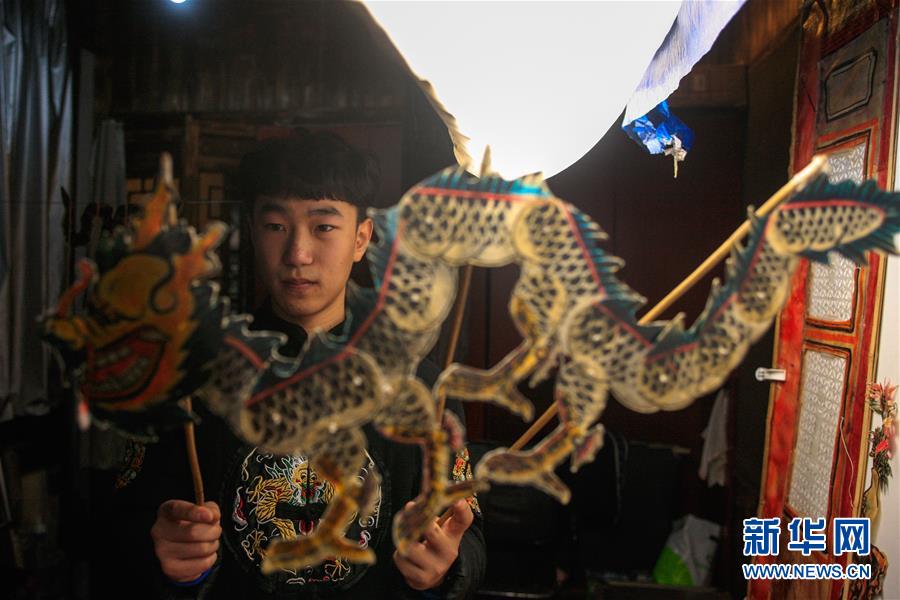 11月20日,在浙江海宁市南关厢历史街区,张坤荣在表演皮影戏前做准备。新华社记者黄宗治摄