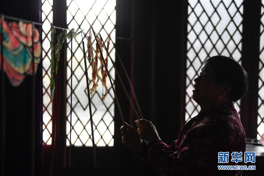 11月20日,在浙江海宁市南关厢历史街区,张坤荣在表演皮影戏前做准备。新华社记者黄宗治摄
