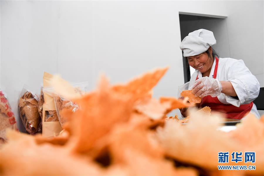 11月22日,姚新花在锅巴厂里包装锅巴。新华社记者张端摄