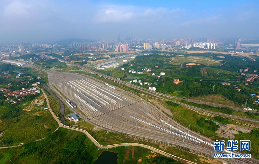 这是广西南宁动车所内准备发往各地的动车组列车(6月18日无人机拍摄)。 广西壮族自治区成立60年来,铁路建设发生翻天覆地的变化。来自中国铁路南宁局集团有限公司的数据显示,1958年广西铁路总里程为1346.3公里,如今广西铁路总里程达5191公里。广西与周边相邻省份间实现动车“公交化”开行。此外,北部湾港—重庆班列、东盟海产品冷链班列、“百色一号”果蔬专列等的开通和运营,强化了铁路供给的针对性和有效性。铁路成为助推广西经济社会快速发展的“大动脉”。 新华社记者黄孝邦摄