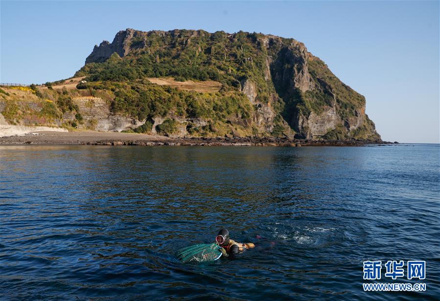 11月23日,一名海女在韩国济州岛的一处海岸附近作业。新华社记者王婧嫱摄