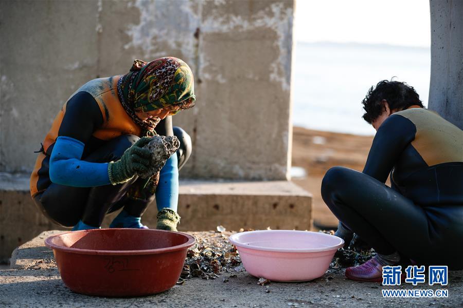 11月23日,海女们在韩国济州岛的一处海岸附近处理打捞出的海产品。新华社记者王婧嫱摄