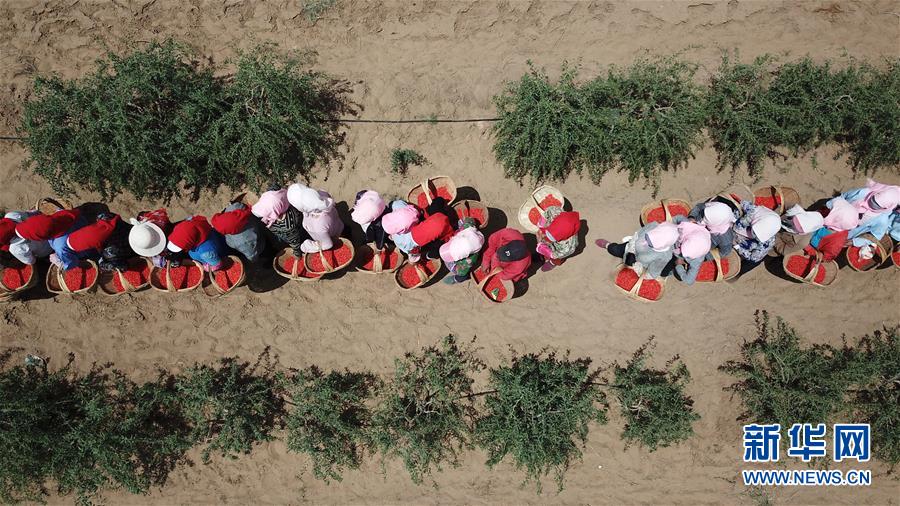 红寺堡生态移民区的移民在百瑞源枸杞种植基地采摘头茬枸杞(5月30日无人机拍摄)。近日,在宁夏吴忠市红寺堡区百瑞源枸杞种植基地,头茬枸杞迎来采摘收获季。今年头茬枸杞采摘期比往年提前20天左右。据了解,该基地地处红寺堡生态移民区,占地3000亩,采摘季节每天有数百名当地移民在田间采摘劳作。新华社记者王鹏 摄