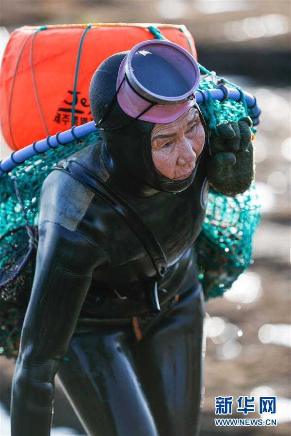11月23日,一名海女在韩国济州岛的一处海岸附近结束作业后上岸。新华社记者王婧嫱摄