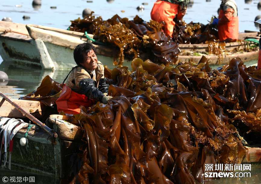 讯 2018年5月26日,在山东省荣成市一海上养殖区,工人们正在收割海带。