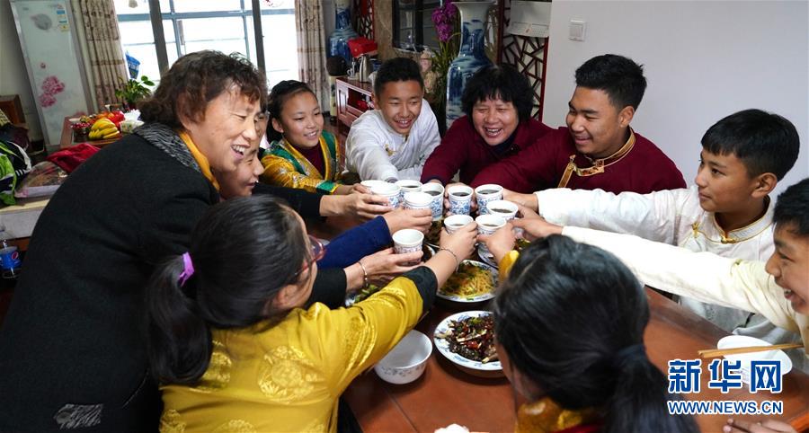 11月16日,南昌市第十七中学西藏班的学生来到刘和平(后排右四)家中吃饭。新华社记者 胡晨欢 摄
