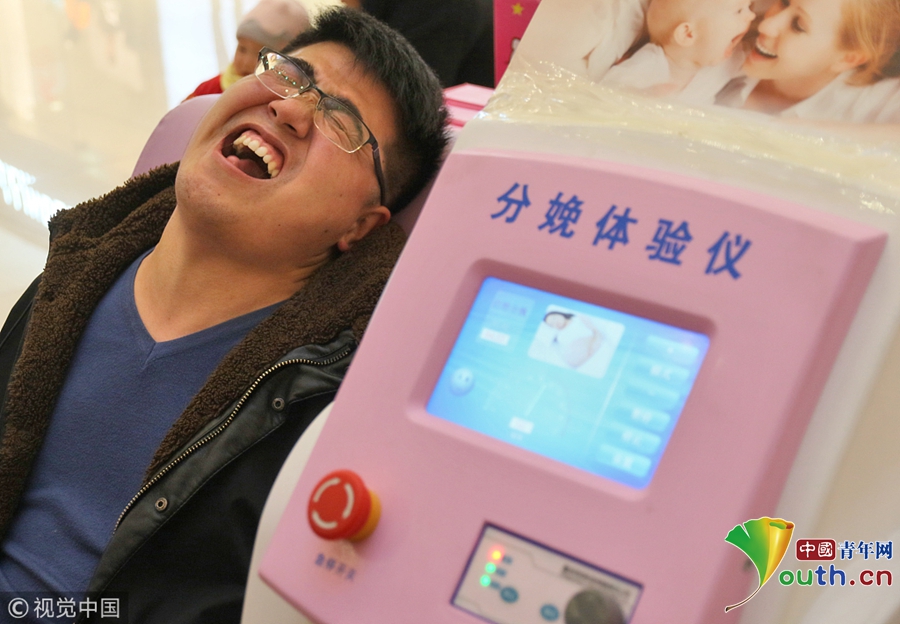 2018年3月8日,“三八”妇女节,山东烟台大悦城提供了一台“分娩体验仪”供男士免费体验,让他们体验女性分娩时的阵痛,了解女性分娩时的忍耐与艰辛。